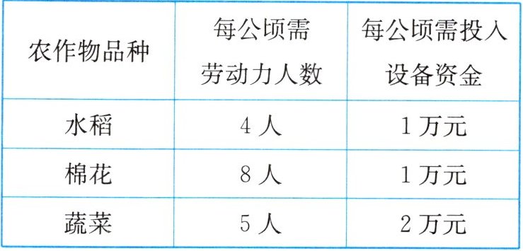 6. 某农场$300名职工耕种51\ hm^2$土地,计划种植水稻、棉花和蔬菜,已知种植各农作物每公顷所需的劳动力人数及投入的设备资金如下表所示.