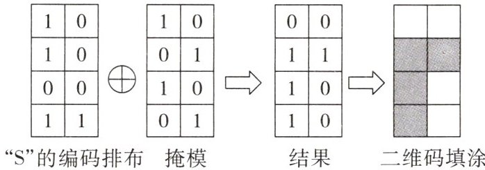 将每个字母的编码按照一定的顺序排布在方格内,例如字母“S”的编码排布如图第一个表格.然后将编码排布与事先排布好0和1的表格(称为掩模)进行“方格一一对应”的“异或”运算(如图第三个表格),并将结果中1的位置填涂灰色,0的位置填涂白色(如图第四个表格).