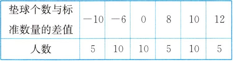 (2)规定垫球达到标准数量记0分,超过标准数量,每多垫1个加2分;未达到标准数量,每少垫1个扣1分,则这个班的垫球总共获得多少分?