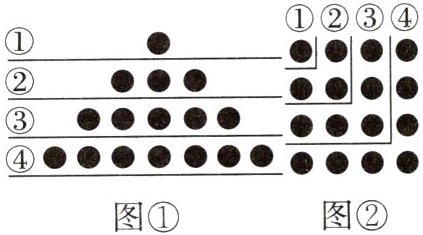 ②数图中棋子的总个数可以有多种不同的方法. 例如,前$2层棋子的个数之和为(1 + 3)或2^{2}$,因此可以得到$1 + 3 = 2^{2}$,同样,前$3层棋子的个数之和为1 + 3 + 5 = 3^{2}$,前$4层棋子的个数之和为1 + 3 + 5 + 7 = 4^{2}$,…$$.