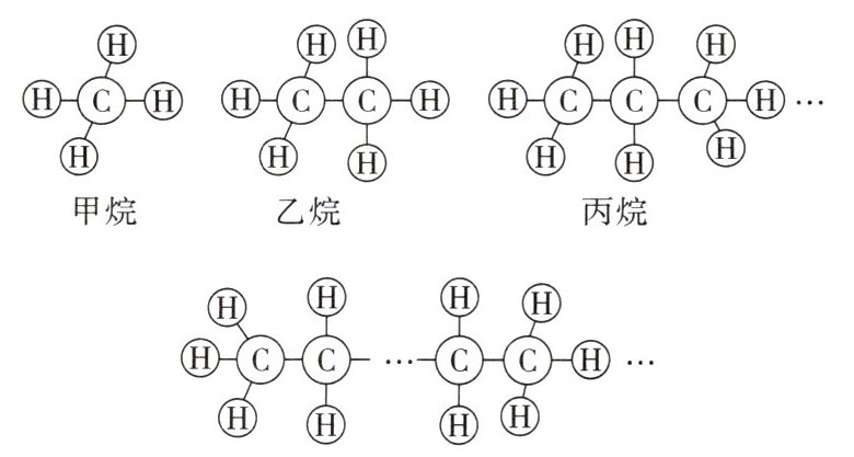 7. (跨学科)烷烃是一类由碳、氢元素组成的有机化合物,在生产生活中可作为燃料、润滑剂等的原料,也可用于动、植物的养护.通常用碳原子的个数命名为甲烷、乙烷、丙烷等,当碳原子数目超过10个时,即用汉字数字表示,如十一烷、十二烷,甲烷的化学式为${CH_{4}}$,乙烷的化学式为${C_{2}H_{6}}$,丙烷的化学式为${C_{3}H_{8}}$……其分子结构模型如图所示,按照此规律,十二烷的化学式为(