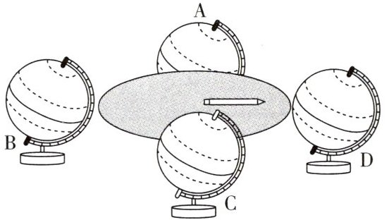 1. 地理课堂上,老师用地球仪沿着用卡纸剪成的椭圆公转轨道平面移动,演示地球公转(下图示)。演示过程中,地球移动的方向是A→______→C→______,地轴的空间指向______。