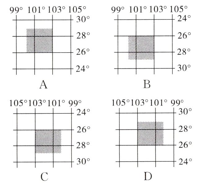 【典题 2】四川省凉山州的地理坐标为 $26^{\circ}N \sim 29^{\circ}N, 100^{\circ}E \sim 103^{\circ}E$。下图阴影部分能表示凉山州位置的是( )