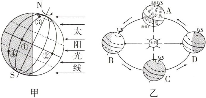 (2)春去秋来,寒来暑往。地球公转引起________________现象,在每年的________________(日期)前后,地球公转到图乙中 A 处,此时,太阳直射在__________(纬线)上。