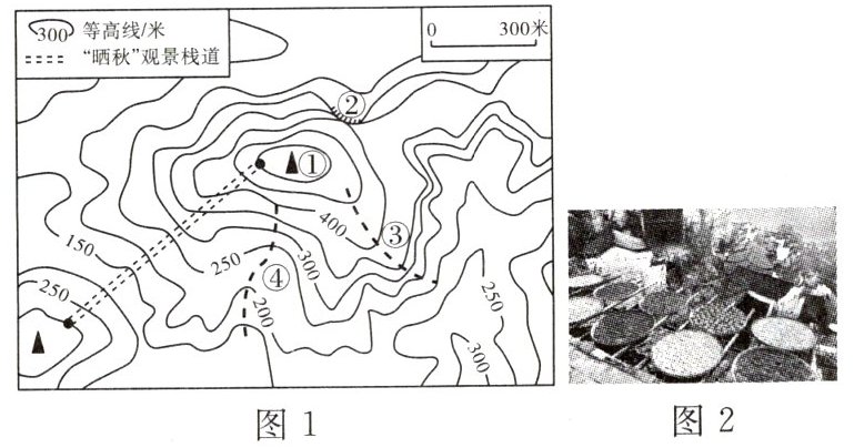 江西省婺源县篁岭村已入选联合国世界旅游组织2023年“最佳旅游乡村”名单,其独特的“晒秋”(晾晒农作物)景观吸引了世界的目光。读篁岭等高线地图(图1)和晒秋景观图(图2),完成5~6题。