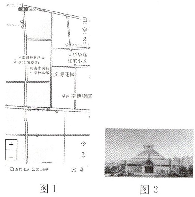 家住云南省的小军,他的哥哥在河南财经政法大学的文南校区就读,今年临近暑假时,小军一家人来河南省接哥哥,他们一家人想顺便利用假期参观河南博物院。如图是小军用手机查到的地图截图(图1)及用手机拍摄的河南博物院建筑外观图(图2)。