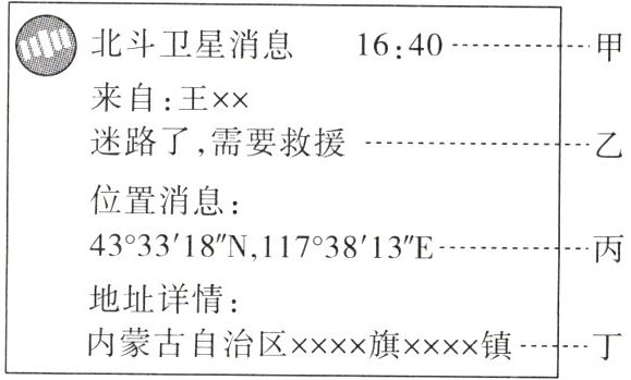 王先生和朋友到内蒙古草原拍摄风景,大雪中与朋友走散,由于没有地面网络信号和朋友失联。王先生通过手机发出北斗卫星消息成功获救。如图是救援队收到的求救信息。据此完成8~9题。