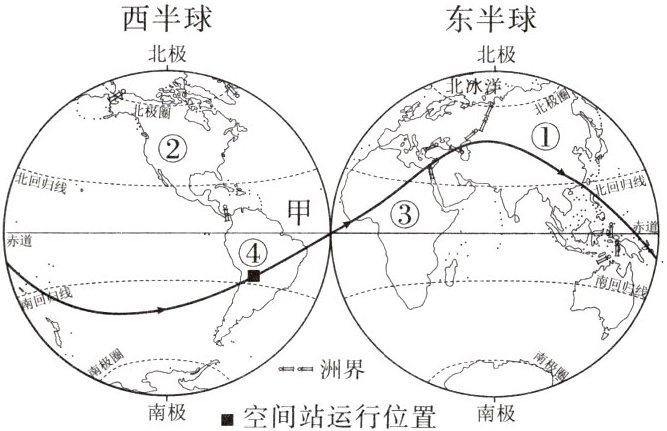 天宫空间站是我国自主研发的绕地飞行的空间站系统,距地约400千米。读天宫空间站某时刻运行位置和轨迹图,完成9~10题。