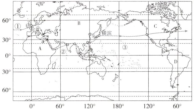 (1)费雷亚·福特从英国伦敦出发,依次经过的大洲是欧洲、A非洲、B______洲、C北美洲。