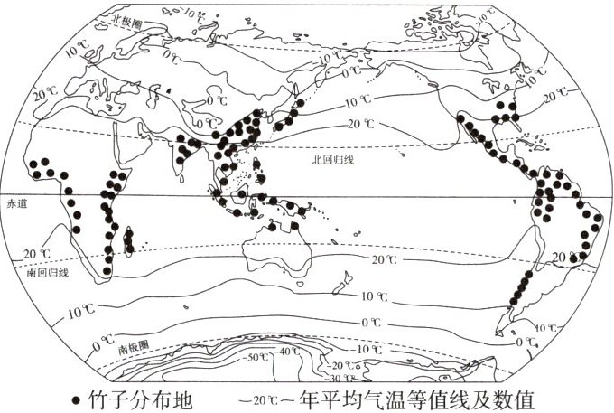 (跨学科·生物)竹子喜温暖湿润,对水热条件要求较高。如图为世界年平均气温及竹子分布图。据此完成9~10题。