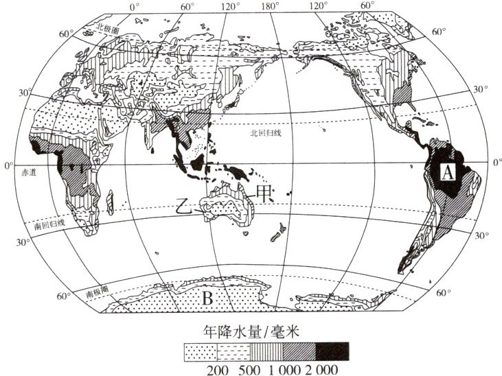 (2)南、北回归线穿过的大陆东岸降水______(填“多”或“少”),大陆西岸及内陆地区降水______(填“多”或“少”),如甲地的年降水量比乙地______(填“多”或“少”)。