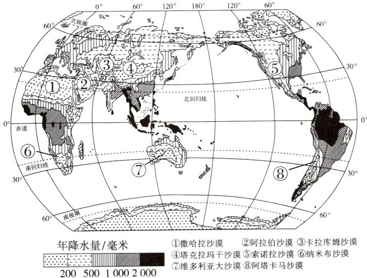 沙漠是地球上分布较广的一种地表景观。沙漠的形成是多种因素共同影响的结果。读世界部分沙漠位置示意和世界年降水量分布图,完成6~7题。