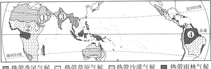 ①代表热带沙漠气候,②代表地中海气候,③代表温带海洋性气候,④代表温带季风气候。