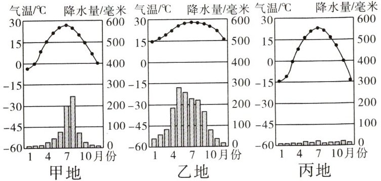 读甲、乙、丙三地气温年变化曲线与各月降水量柱状图,完成1~2题。
