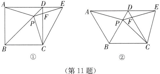 11. 如图①,在正方形 ABCD 中,P 为对角线 BD 上的一点,点 E 在 AD 的延长线上,且 PA= PE,PE 交 CD 于点 F,连接 CE,CP。