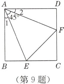 9. 如图,正方形 ABCD 的边长为 1,∠EAF= $45^{\circ}$,AE= AF,则下列结论:①∠1= ∠2= $22.5^{\circ}$;②点 C 到 EF 的距离是 $\sqrt{2}-1$;③△ECF 的周长为 2;④BE+DF>EF。其中正确的结论是