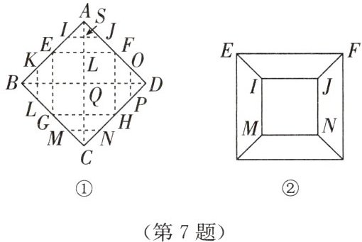 7. 如图,在叠小纸船时,其中某一步需要先将图①的正方形纸片$ABCD分别沿四等分线IJ$,$KL$,$MN$,$OP$折叠一次,再分别沿二等分线$EF$,$EG$,$GH$,$FH$折叠一次,得到图②形状. 若正方形$ABCD的边长为8$,则折叠后的四边形$EIJF$的面积为