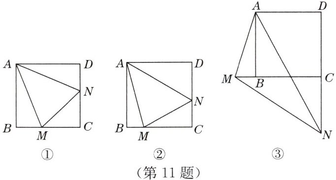 11. 在正方形 $ABCD$ 中,$\angle MAN = 45°$,$\angle MAN$ 绕点 $A$ 顺时针旋转,它的两边分别交 $CB$,$DC$(或它们的延长线)于点 $M$,$N$。