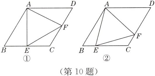 10. 在菱形 $ABCD$ 中,$\angle B = 60°$,动点 $E$ 在边 $BC$ 上,动点 $F$ 在边 $CD$ 上。