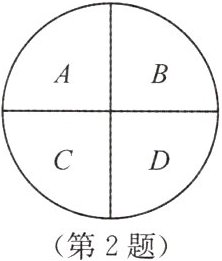 2. 如图,一个圆盘被平均分成A,B,C,D四个区域,向圆盘随机投掷飞镖,飞镖落在四个区域的机会均等,飞镖落在圆盘外的不计,连续两次投掷,落在同一区域的概率是(