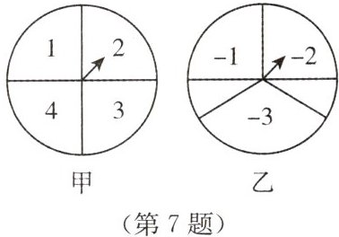 7. (中华优秀传统文化)抖空竹在中国有着悠久的历史,它是靠四肢巧妙配合完成的运动项目,有助于人们的身体健康. 某校开展“抖空竹,学非遗”比赛活动,九(1)班的小华和小明都想参加,他们水平相当,但参赛名额只有一个,老师商议后,决定在他们二人中确定一名,老师准备了两个可以自由转动的转盘甲、乙(如图所示). 游戏规则:同时转动两个转盘,转盘停止后,当两个指针所指区域的数字之和为 1 时,小华获胜;当数字之和为 0 时,小明获胜,其他情况视为平局. 如果指针恰好指在分割线上,那么重转一次,直到指针指向某一区域为止.
