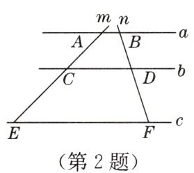 2. 如图,已知直线 $ a// b// c $,直线 $ m $,$ n $ 与直线 $ a $,$ b $,$ c $ 分别相交于点 $ A $,$ C $,$ E $,$ B $,$ D $,$ F $.若 $ AC = 4 $,$ CE = 6 $,$ BD = 3 $,则 $ BF $ 等于(