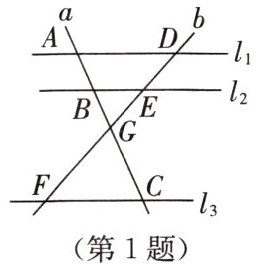 1. 如图,$ l_{1}// l_{2}// l_{3} $,直线 $ a $,$ b $ 相交于点 $ G $,与这三条平行线分别相交于点 $ A $,$ B $,$ C $ 和点 $ D $,$ E $,$ F $,下列比例式中错误的是(