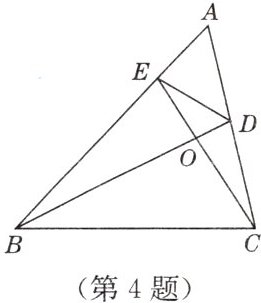 4. 如图,已知点$D$,$E分别为\triangle ABC的边AC$,$AB$上的点,$BD$,$CE交于点O$,且$\frac{EO}{BO}= \frac{DO}{CO}$,试问:$\triangle ADE与\triangle ABC$相似吗?请说明理由。