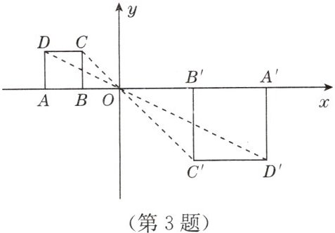 3. 如图,正方形$ABCD的顶点A$,$B的坐标分别为(-2,0)$,$(-1,0)$,顶点$C$,$D$在第二象限内. 以原点$O$为位似中心,将正方形$ABCD放大为正方形A'B'C'D'$. 若点$B'的坐标为(2,0)$,则点$D'$的坐标为