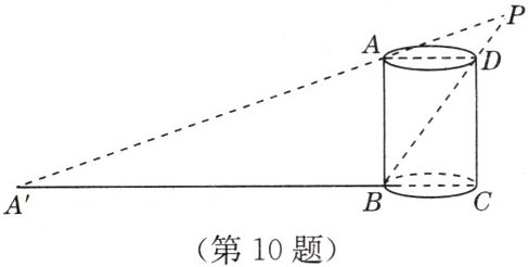 10. 如图,一个圆柱形无盖器皿,直径 $AD = BC = 3$,灯泡 $P$ 到 $CD$ 的距离为 $1$,点 $D$ 在灯泡 $P$ 下的投影恰好为点 $B$,点 $A$ 在灯泡 $P$ 下的投影为点 $A'$,求点 $A'$ 到 $CD$ 的距离.(注:点 $A'$,$B$,$C$ 在同一条直线上)