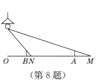 8. 如图,路灯距地面 $8$ m,身高 $1.6$ m的小明从点 $A$ 处沿 $AO$ 所在的直线行走 $14$ m到点 $B$ 时,人影(