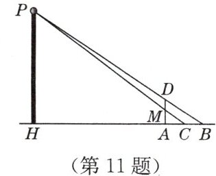 11. 如图,小欣站在路灯 $P$ 下的投影 $AB = 2.4$ m,蹲下时,其投影 $AC = 1.05$ m,小欣的身高 $AD = 1.6$ m,蹲下时的高度等于站立高度的一半,求路灯离地面的高度 $PH$.
