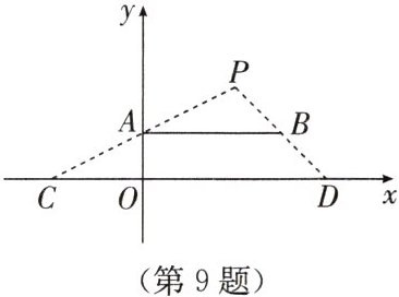 9. 如图,在平面直角坐标系中,点光源位于 $P(4,4)$ 处,木杆 $AB$ 两端的坐标分别为 $(0,2)$,$(6,2)$,则木杆 $AB$ 在 $x$ 轴上的影长 $CD$ 为