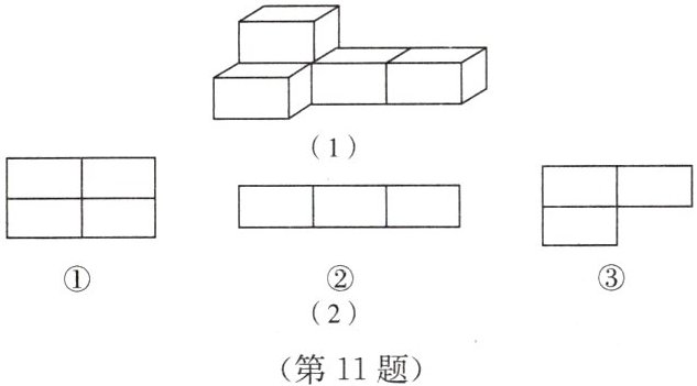 11. 图(1)是由5个相同的长方体堆成的物体,试改变图中物体的形状,使它的俯视图分别如图(2)所示.请画出改变后的各种堆放形状。
