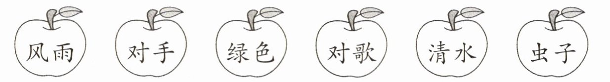 将第一个苹果形状中“风雨”二字涂上颜色(颜色可自选,如红色、黄色等)。