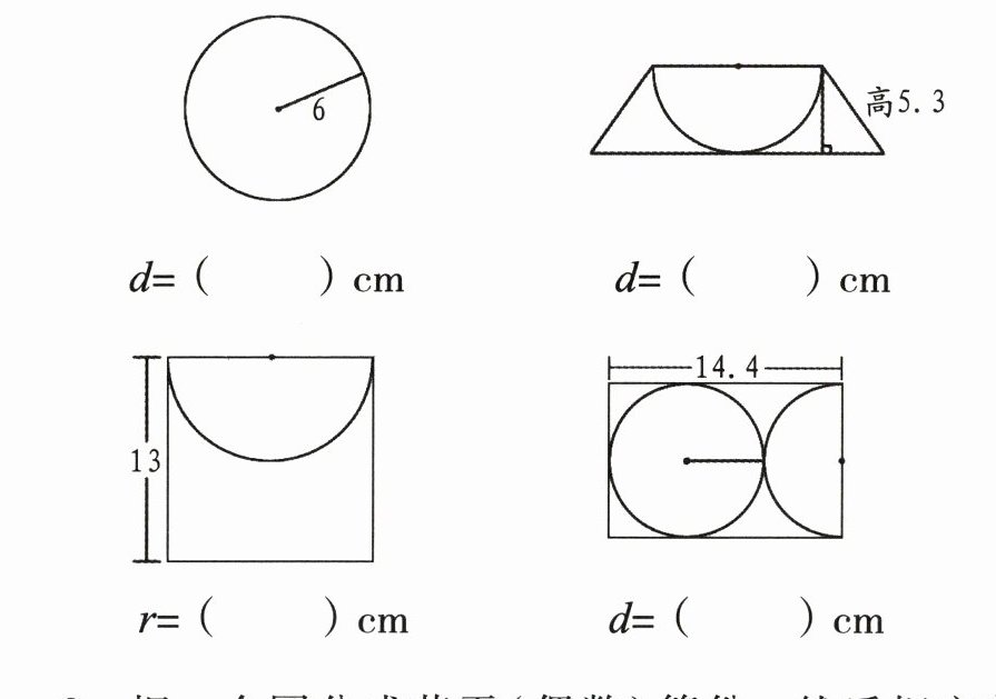 第一个图形:圆的半径$r = 6cm$,根据$d = 2r$,可得直径$d = 2×6 = 12(cm)$。