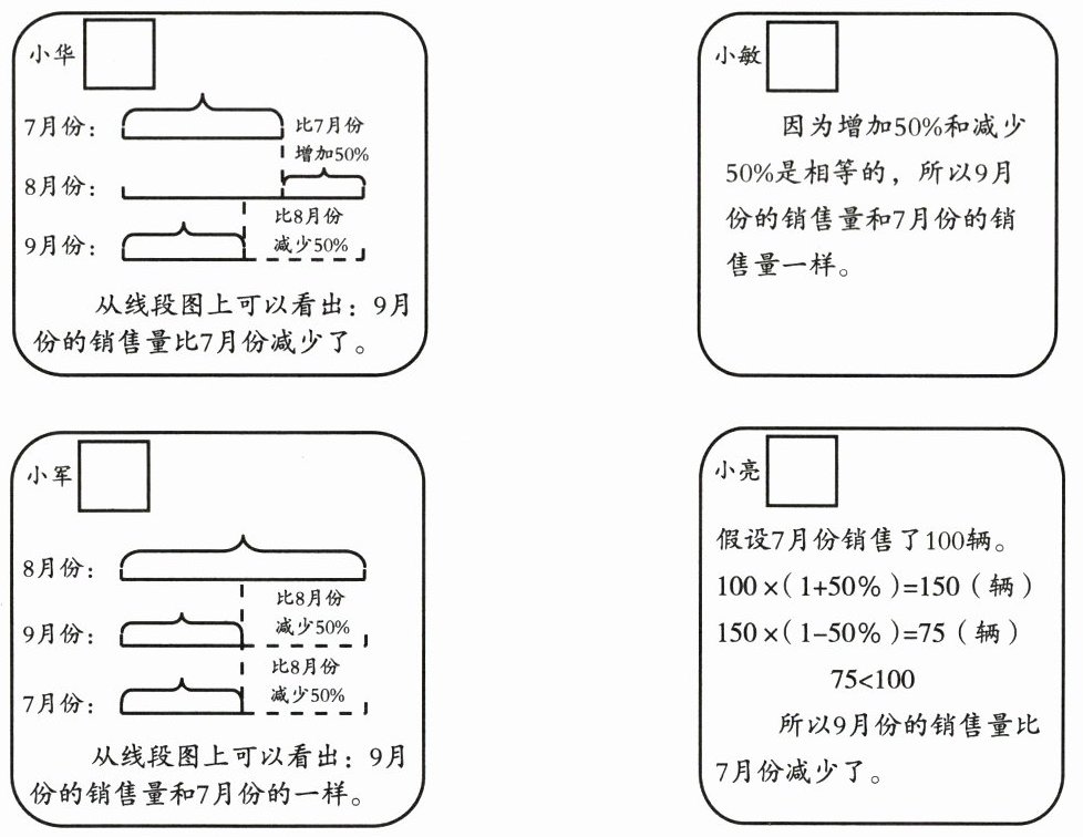 5.某款童车8月份的销售量比7月份增加了50%,9月份的销售量又比8月份减少了50%。9月份的销售量与7月份相比,是增加了还是减少了?下面是四位同学的思考过程。