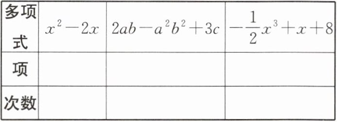 第1行从左到右依次填:$x^{2},-2x$ 2ab,$-a^{2}b^{2},$ 3c $-\frac {1}{2}x^{3},x,8$ 第2行从左到右依次填:2 4 3
