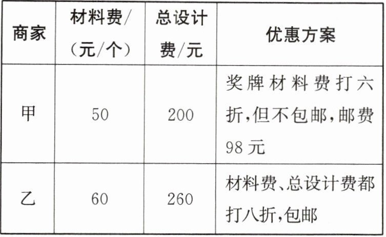 4. 甲、乙两商家制作某种奖牌的费用如下表所示。