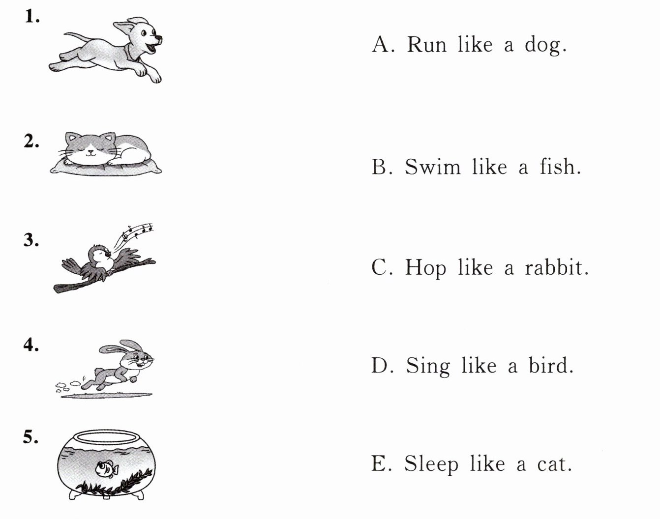 |A. pets|B. fish|C. sing|D. like|E. rabbits|