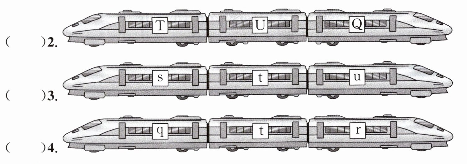Ⅳ. Look and judge. (按字母表的顺序正确排列的小火车才能启动。下列哪些小火车可以启动呢?能启动的打“√”,不能启动的打“×”。)