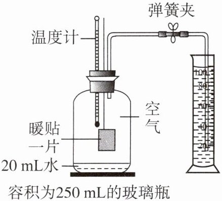 5. 某品牌暖贴(主要成分为铁粉、木炭、食盐)的热量来源于铁粉的氧化。小涛同学设计使用暖贴来测定空气中氧气的含量,实验开始前的装置如图所示,实验后从量筒中流入玻璃瓶(容积为250mL)中的水的体积为45mL(铁粉生锈消耗的水忽略不计)。下列说法错误的是(
