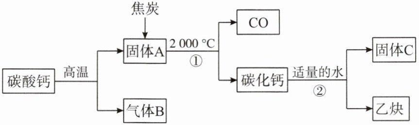 碳酸钙→高温→固体A+气体B;固体A+焦炭→2000℃→CO+碳化钙;碳化钙+适量的水→固体C+乙炔