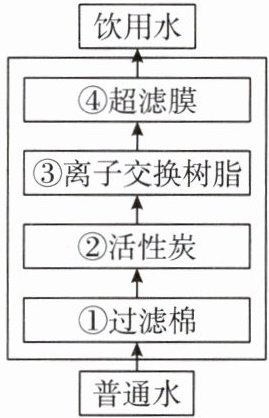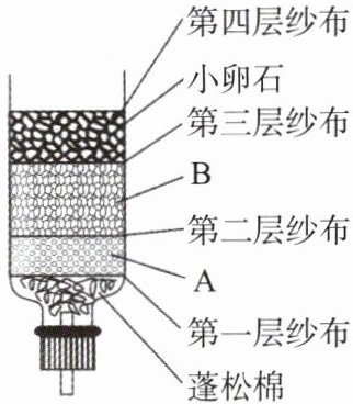 (3)题干中所给的小卵石、石英砂都是起过滤作用,过滤应由粗到细,先用小卵石过滤掉颗粒比较大的杂质,再用石英砂过滤掉颗粒比较小的杂质,所以 B 层最好放石英砂,A 层放置的材料是活性炭,除去水中的色素和异味。