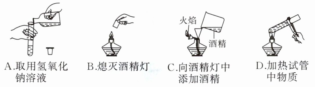 B 解析 取用液体试剂时,瓶塞要倒放,A项错误;熄灭酒精灯时,不能用嘴吹灭酒精灯,应用灯帽盖灭,B项正确;禁止向燃着的酒精灯中添加酒精,C项错误;加热液体时,试管中的液体体积不能超过试管容积的三分之一,D项错误。