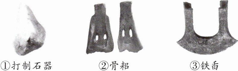 C 打制石器主要是元谋人、北京人等旧石器时代的原始人类使用的生产工具;骨耜是新石器时代的河姆渡人等使用的生产工具;铁丒出现于春秋战国时期。故题干图片中的生产工具按照出现时间的先后顺序排列正确的是①②③,选C项。