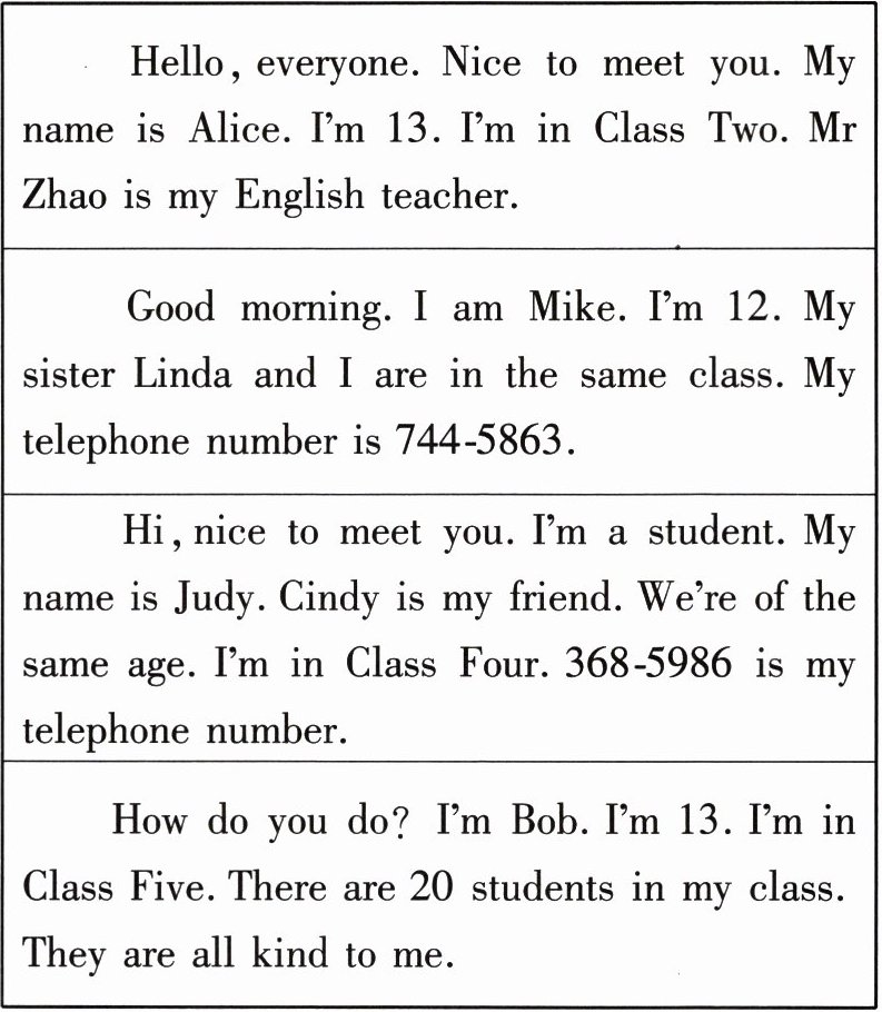 | How do you do? I'm Bob. I'm 13. I'm in Class Five. There are 20 students in my class. They are all kind to me. |