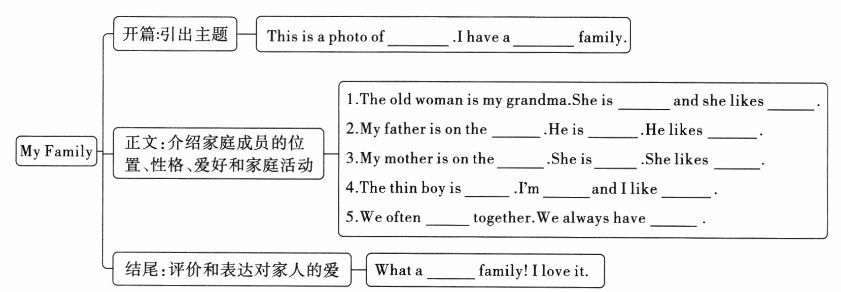 The old woman is my grandma. She is a kind woman and she likes cooking. My father is on the left. He is a funny man and he often makes us laugh. He likes swimming. My mother is on the right. She is a happy woman. She likes music. The thin boy is me. I'm quiet and I like reading. We often watch TV at night together. We always have much fun. (介绍家庭成员的性格、爱好和家庭活动)
