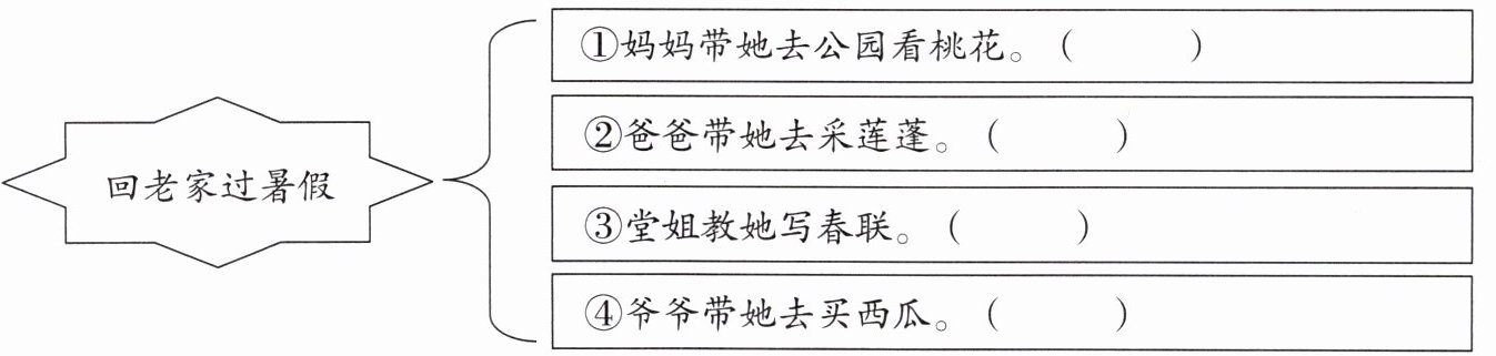 二、西西在作文《回老家过暑假》中写了四件事。 请你在括号里给合适的材料打“√”。