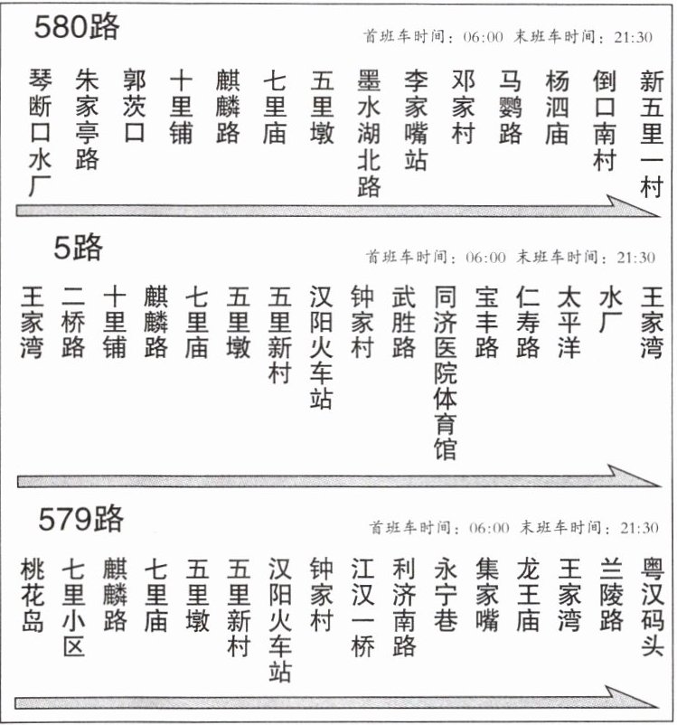 1.七里庙 五里墩 2.06:00 不能 3.小明应该乘坐580路公交车在琴断口水厂站上车,可以到麒麟路或七里庙或五里墩站下车,换乘579路公交车乘坐到粤汉码头。